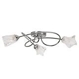 3 x 40w G9 Halogen Bulbs are Supplied.Measurements: Height 150mm x Diameter 380mm.Free Delivery - Ref number 16184.Modern 3 Way Tangled Ceiling Light in a Silver Chrome Finish.Decorative Frosted Glass Shades. Modern 3 way tangled curved arm ceiling light in a chrome finish with decorative frosted glass shades. This item comes supplied with 40w g9 halogen bulbs. Ceiling lights are usually the main source of illuminating a room but with the many styles on offer today, also become a main focal point or talking point. The right fitting can make a real style statement and complete your living space look.